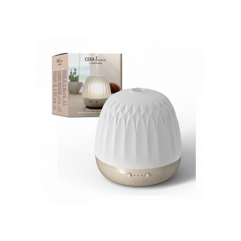 El modelo céra de pranarôm es un difusor ultrasónico y multisensorial de aceites esenciales. Un difusor de aromas es un pequeño electrodoméstico que nos ayuda a cuidar nuestra salud y con el que podemos ayudar a nuestra familia. Tiene un diseño elegante fabricado en madera noble y cerámica, te seducirá con su elegancia de inspiración italiana: la madera de hevea revela un bello color, mientras que la cúpula de cerámica deja entrever una sutil luz ambiental a través de un juego de transparencias con motivos que recuerdan a las líneas arquitectónicas de muchos edificios italianos. El difusor ultrasónico cera barocco pranarôm funciona con cable a la red para evitar el continuo desgaste de pilas. Es pequeño y compacto con lo que no ocupa mucho y cabe en cualquier mesilla o estantería. Recomendado para habitaciones de unos 20 m². Tiene una luz ambiental original que sigue el ritmo de la respiración para producir una auténtica sensación de relajación y descanso. La suave luz se coordina con el ritmo de la respiración para crear una auténtica sensación de relax y descanso. También puede permanecer fija.