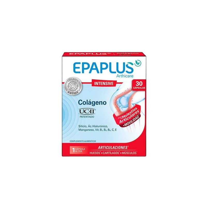 Epaplus arthicare intensive colágeno ucii 30comp es un complemento alimenticio indicado para personas que sufren molestias articulares. Contiene colágeno, para contribuir al sistema inmune, extracto de bambú para calmar las molestias, manganeso para el mantenimiento de los huesos y cobre, para mantener el tejido conectivo. Favorece el mantenimiento de huesos, cartílagos y tejido conectivo en condiciones normales, y su fórmula rica en vitaminas ayuda, además, a reducir el cansancio.