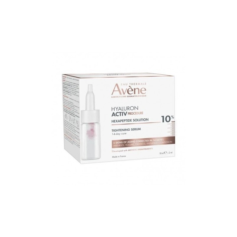 Este sérum antiedad de la gama avène hyaluron activ procedure ha sido desarrollado en colaboración con dermatólogos estéticos para ofrecer un tratamiento intensivo de 14 días, enfocado en corregir cinco signos visibles del envejecimiento: arrugas (contracción, frente, patas de gallo, surcos nasogenianos), pérdida de volumen, falta de firmeza, luminosidad y tono desigual. Solución de hexapéptidos 10%: inspirada en el mecanismo de acción de las inyecciones botulínicas, ayuda a reducir la apariencia de arrugas. Niacinamida 6%: estimula la renovación celular y prolonga la vida de las células cutáneas para reforzar los signos del envejecimiento. Ácido hialurónico 1%: hidrata, rellena y alisa la piel para mejorar textura y aspecto. Fórmula con un 94% de ingredientes de origen natural, textura en gel ligera, no pegajosa, apta para pieles sensibles.